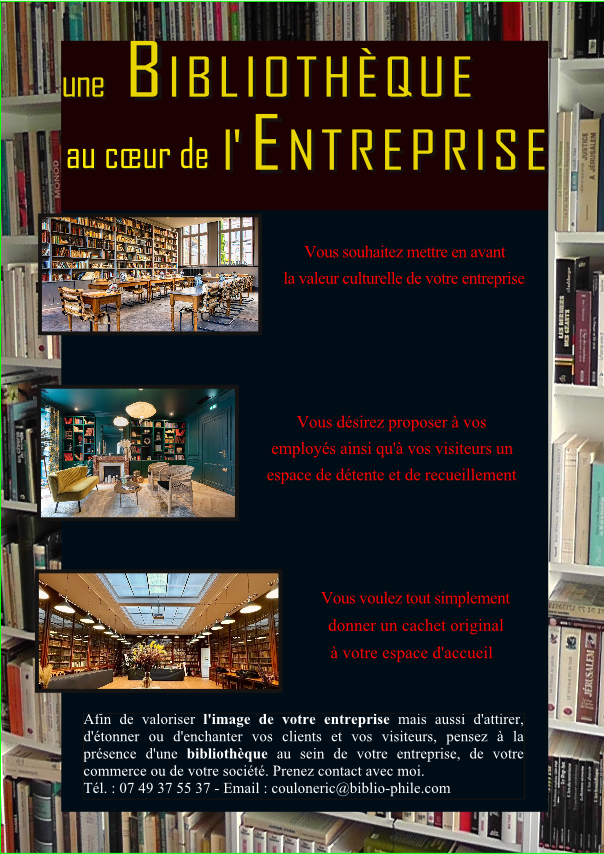 Pour ce qui est plus particulièrement du service-Bibliothèque, je vous propose non seulement de vous conseiller et de vous accompagner dans la constitution ou le développement de votre bibliothèque mais aussi de vous fournir les livres correspondant à votre choix, bien entendu dans la mesure du possible.